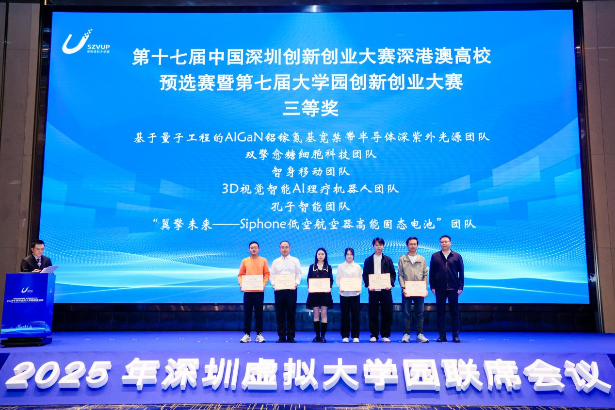 会议举行了2024年度深圳虚拟大学园成员院校公益指数运行评价A等级研究院颁奖仪式,山东大学深圳研究院再次获评深圳虚拟大学园公益指数运行评价A等级。会议还举行了第十七届深创赛深港澳高校预选赛暨第七届大学园创新创业大赛颁奖仪式,由我院组织推荐的“智能望远镜项目”获得二等奖,“多材料3D打印机和配套可降解光敏生物基材料制备及应用”“首创1型糖尿病免疫细胞精准靶向治疗策略与产业化”“翼擎未来—Siphone低空航空器高能固态电池”等三个项目获得三等奖。