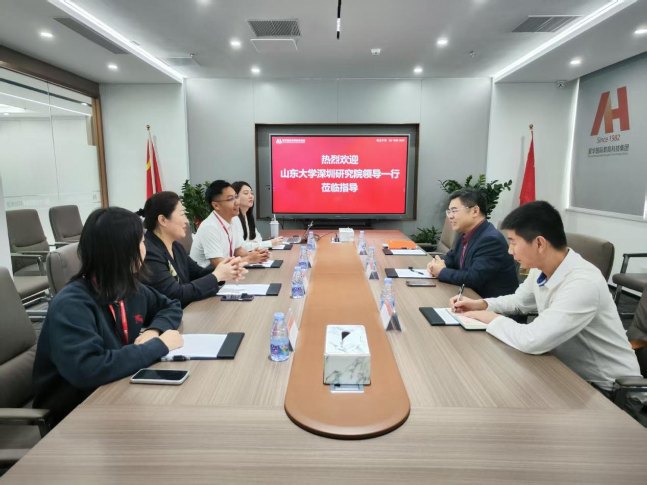 臧守信介绍了爱华教育的发展历程和业务情况,周庆华介绍了山东大学深圳研究院的建设发展情况。双方围绕学历教育、教育培训、国际教育、国际认证培训、数智化人才培养等业务进行深入交流。