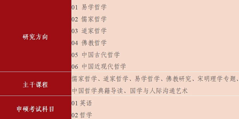 旨在培养在中国哲学专业具有坚实基础、系统的专业知识和熟练的专业技能,能够从事中国哲学、中国宗教、中国文化研究和教学的高层次人才,以及宣传、管理、新闻、出版、宗教、对外文化交流等部门的理论与实际工作者。