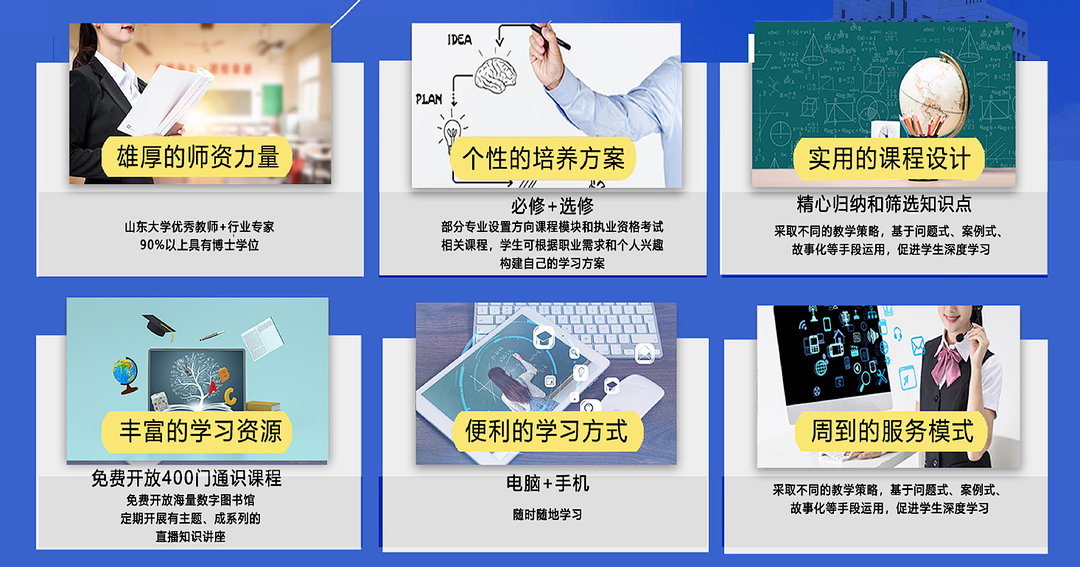 山东大学是我国最早从事成人高等教育、网络高等教育和非学历培训的高等院校之一。经过二十年的不懈努力,山东大学网络教育已经成为国内知名品牌。自主开发了800余门网络课程,拥有丰富的网络教学资源;开设了18个本科专业和1个专科专业,并推出了面向行业、系统的特色专业。基本建成了现代远程教育资源系统和服务体系,取得了良好的社会声誉。