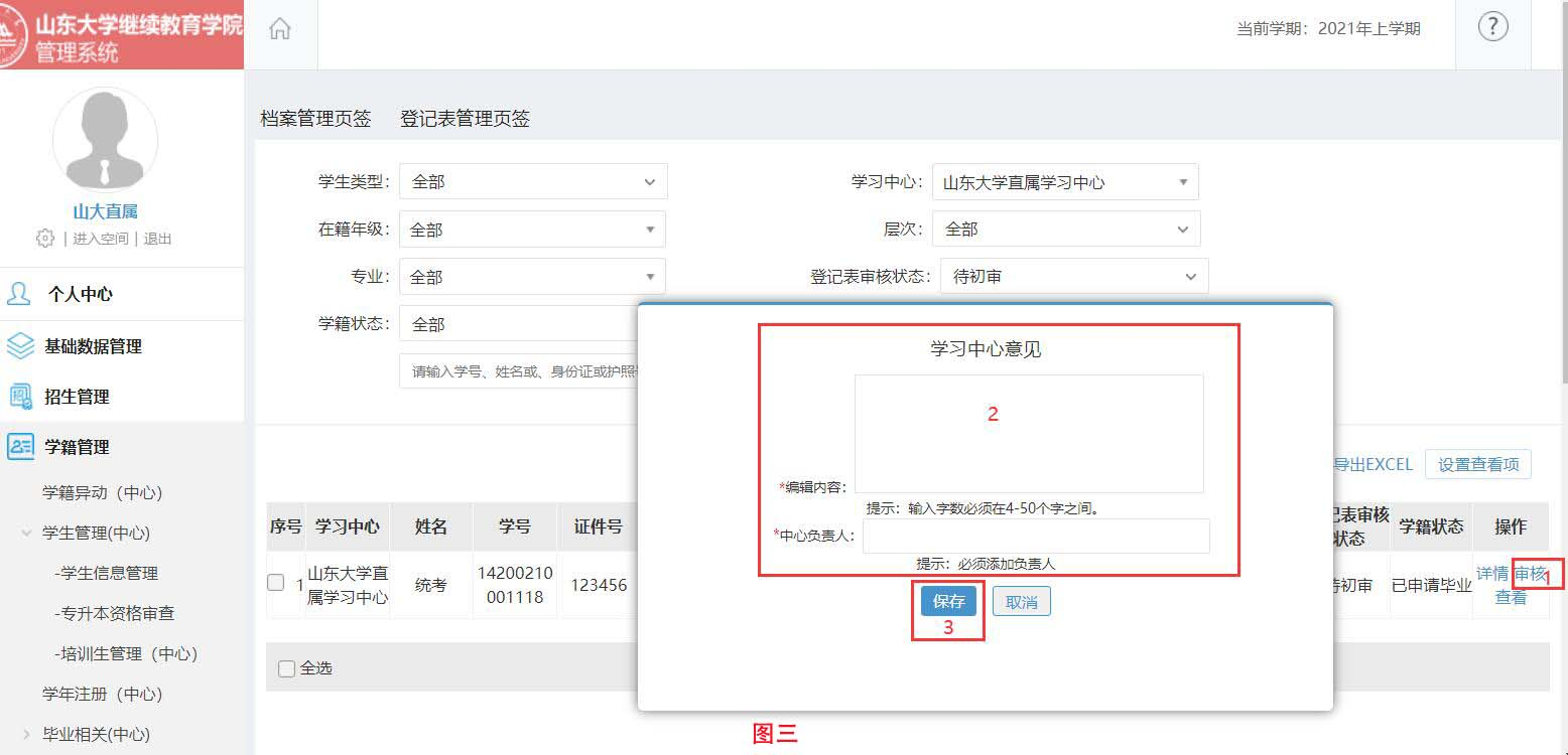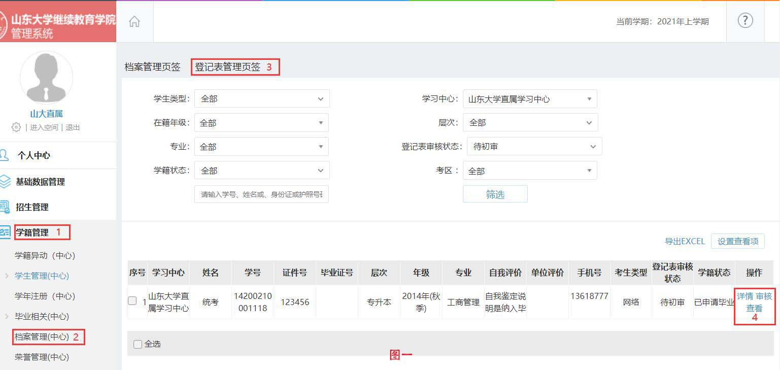 学习中心、函授站负责老师须通过“档案管理(中心)”(图一)对“已申请毕业”的学生进行“自我鉴定”(图二)和“毕业资格”(图三)初审。