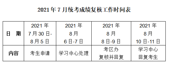 根据2021年7月统考工作计划,现将本次考试成绩复核工作有关事宜通知如下: