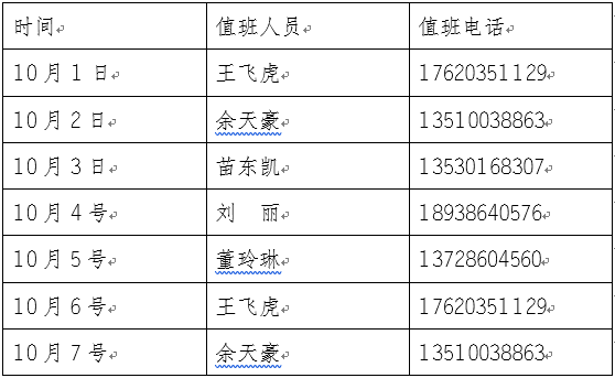 放假期间值班安排及联系方式请见下表: