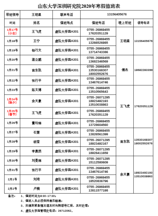 三、春节期间安排人员值班,详情请见《山东大学深圳研究院2020年寒假值班表》,值班人员要确保手机通畅,遇到特殊情况及时汇相关领导及虚拟大学园管理处。
