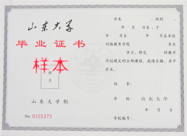 学生在规定时间内修满教学计划规定的学分,达到毕业要求者,颁发教育部统一电子注册、国家承认学历的山东大学毕业证书(网络教育)。专升本学生在毕业前需通过试点高校网络教育公共基础课全国统一考试。