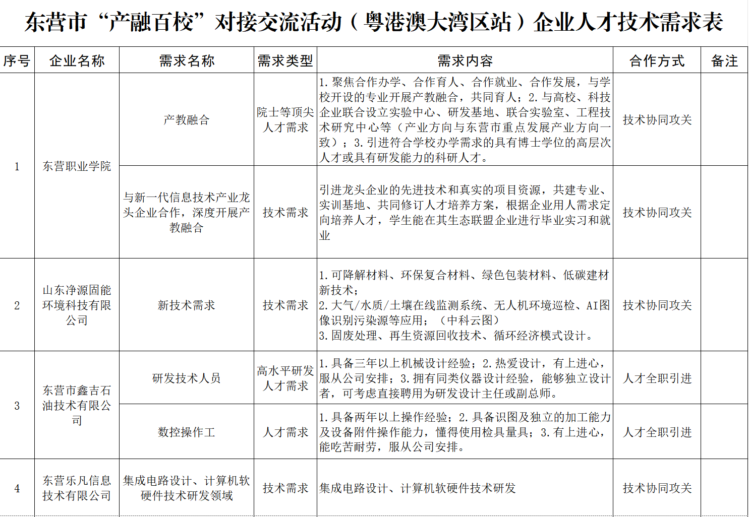 我们协助东营市委人才办、东营市委组织部、东营市人力资源和社会保障局、山东省黄河三角洲可持续发展研究院发起组织的“产融百校”(粤港澳大湾区站)系列对接交流活动定于9月中下旬在广州、深圳两地举办,现把《东营市“产融百校”对接交流活动(粤港澳大湾区站)企业人才技术需求表》发布出来,请各单位知悉。
