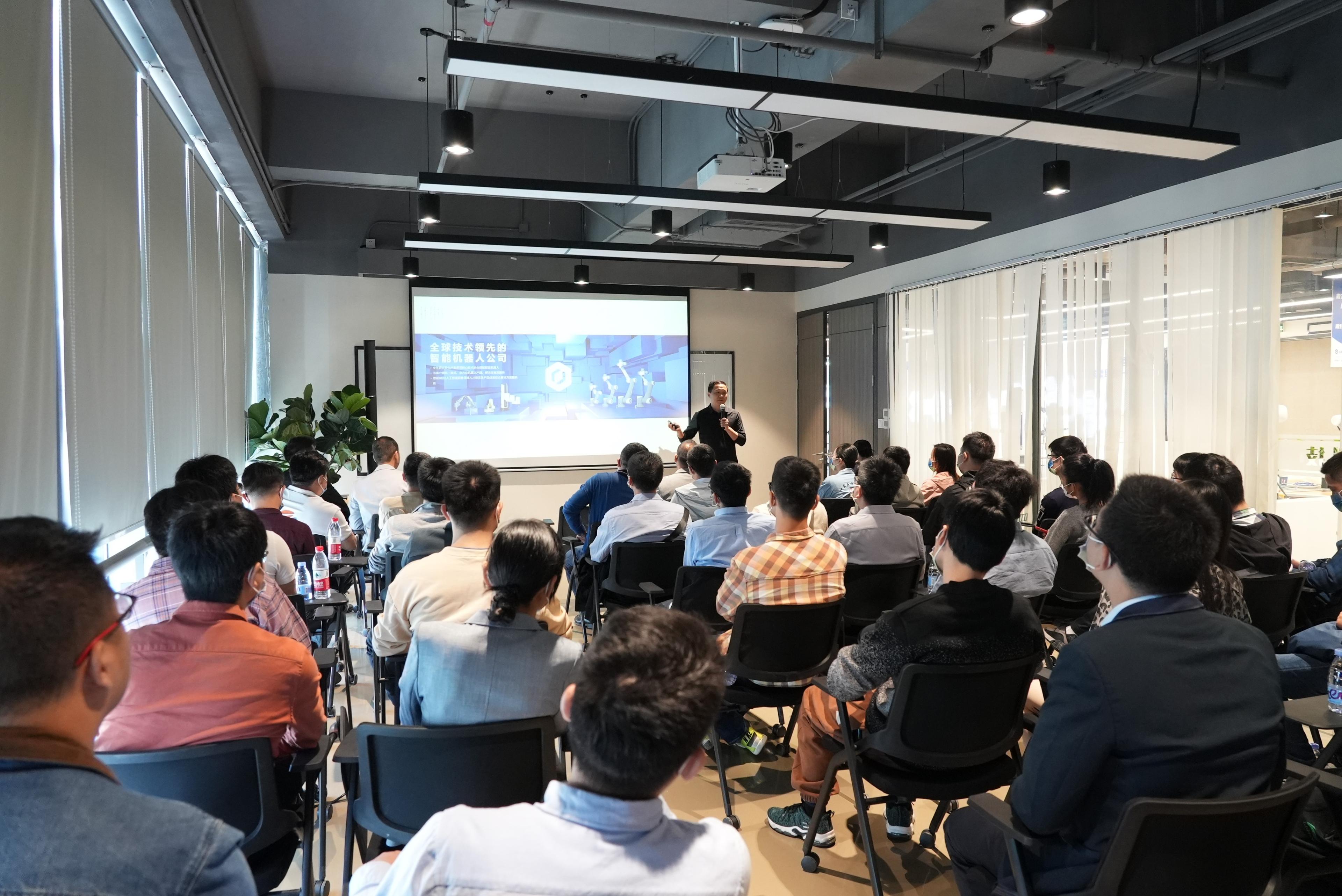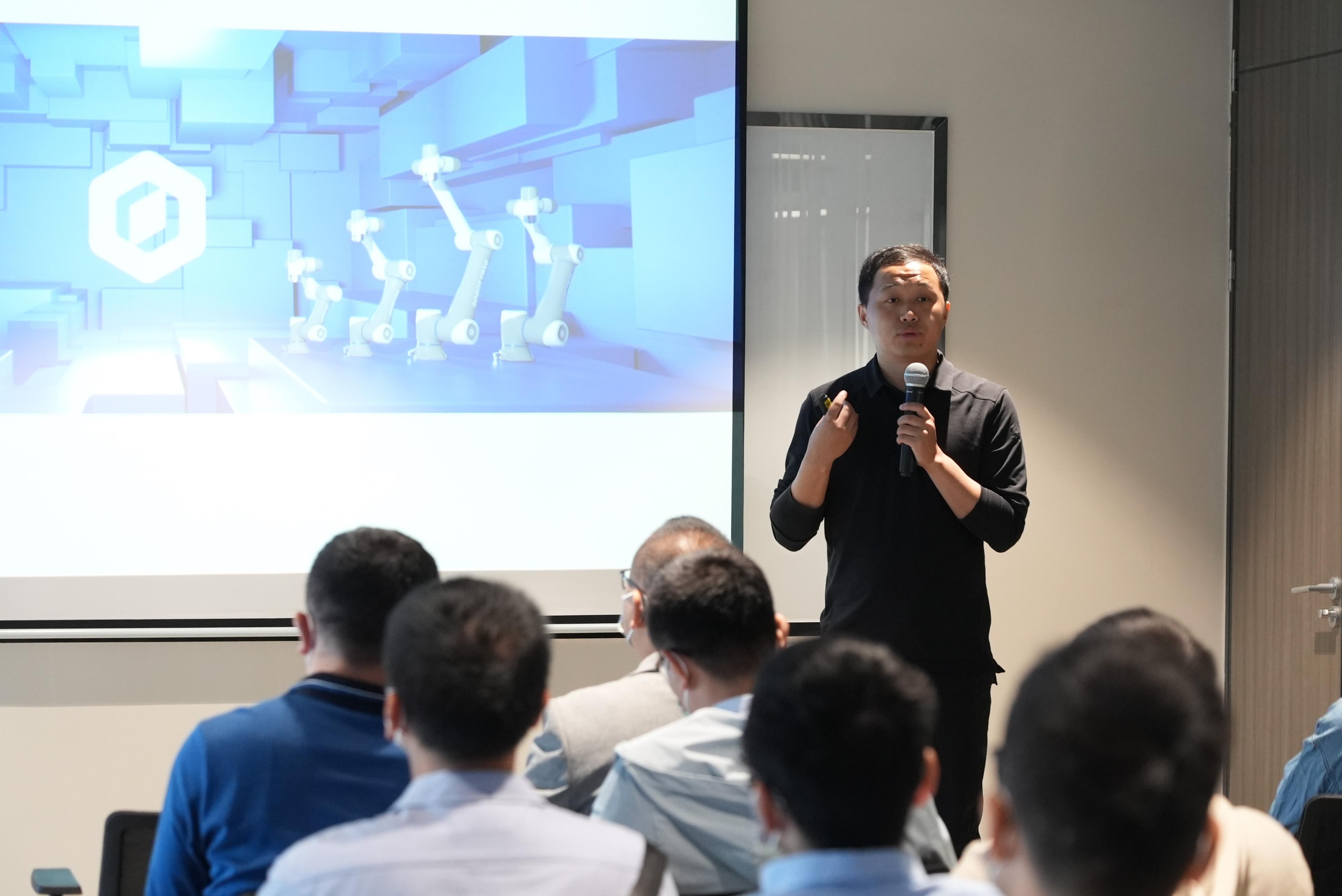 座谈交流环节中,刘培超首先对学弟学妹的来访表示热烈的欢迎,接着全方位地介绍了越疆科技的发展历程、发展现状、主要产品、行业发展前景以及公司的未来展望等。听完刘培超学长的详细介绍后,同学们围绕机械臂的研发技术以及在智能制造领域的应用等问题与其进行了深入探讨和交流,刘培超向大家展示了应用场景和解决方案。通过现场交流,同学们对机械臂和人工智能在智能制造中发挥的作用有了更深入的了解,并表示希望能与越疆进一步开展合作,解决一系列生产研发中遇到的问题。