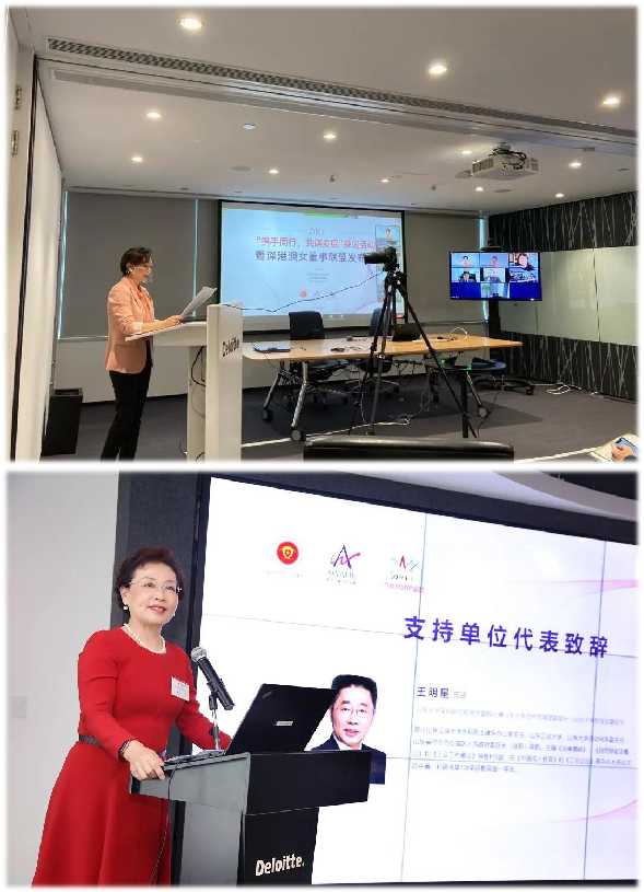 3月8日下午,2021“携手同行,共谋发展”联谊活动暨深港澳女董事联盟发布会在德勤大湾区双创中心隆重举行。本次活动由深圳市妇女联合会指导,深圳市女财经工作者协会、香港女会计师协会、澳门女会计师协会共同主办。深港澳女董事联盟主席、中国人民政治协商会议第十三届全国委员会委员、恒生银行原副董事长兼行政总裁梁高美懿、深港澳女董事联盟深圳主席、绿景(中国)地产投资有限公司董事会主席黄敬舒、深圳市妇女联合会主席马宏、香港特别行政区政府财经事务及库务局副局长陈浩濂、澳门特别行政区政府经济及科技发展局副局长陈子慧、香港独立非执行董事协会会长李家晖、澳门天空时报社长欧阳泽光以及深圳市女财经工作者协会会长朱彦、香港女会计师协会创会会长罗君美、澳门女会计师协会创会会长陆丹青等来自深圳、香港、澳门三地财经界近300位专业人士参加了活动。本次活动采用线上线下联合举办的形式召开,由香港女会计师协会会长陈远秀与深圳研究院副院长、深圳市女财经工作者协会常务副会长傅杰连线主持。山东大学深圳研究院常务副院长王明星出席活动并致辞。