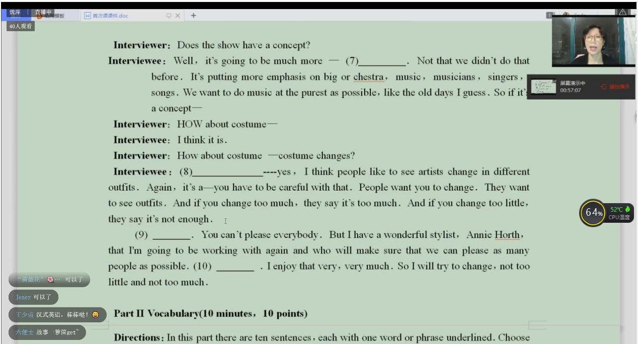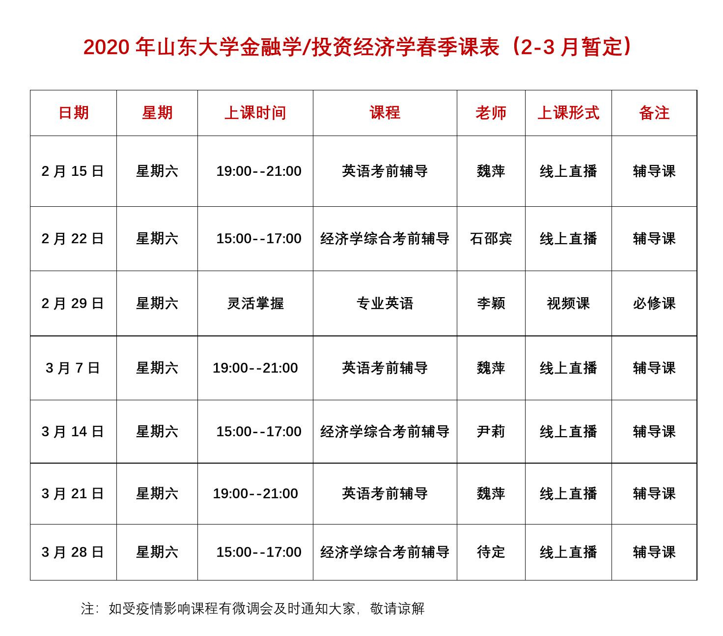2月15日,山东大学金融学/投资经济学硕士(深圳班)第一堂同等学力申硕英语辅导线上直播课正式上线,研究院金融学硕士深圳班一期、二期的学员准时参与了线上教学课程。为了保证在线学习教学质量,线上授课建立三步走机制:课前发布预习资料,课中同步直播教师课件,课后跟踪调研教学效果,并根据直播课程的实际情况随时进行授课内容和难度的调整。同时加强与学生的日常互动,定时在学生交流群发布小测试、每日一练、问题解答等一系列辅助教学形式督促学生自主学习,巩固课堂知识。从第一期课程教学结果来看,在线课程达到预期效果,获得参与师生的一致好评。