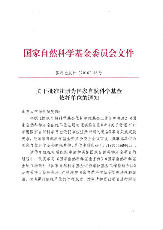 2016年11月29日,山东大学深圳研究院(以下简称“研究院”)正式成为国家自然科学基金依托单位。从2017年起,山东大学深圳研究院可以独立申报国家自然科学基金委的项目,包括国家自然科学基金委与广东省人民政府(NSFC-广东联合基金)、深圳市科创委的联合项目(如NSFC-深圳机器人项目)等。