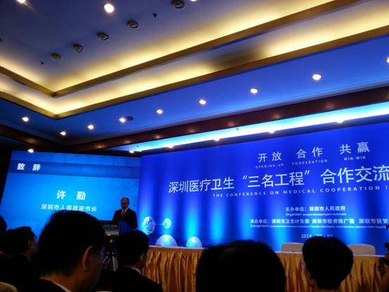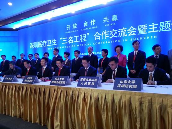 2014年9月22日,深圳市人民政府在北京深圳大厦举办了深圳医疗卫生“三名工程”合作交流会,会议的主题是开放、合作、共赢。此举措是深圳市人民政府为全面提升深圳特区医疗卫生质量,集聚优质资源,打造国际化医疗中心,以“名医(名科)、名院、名诊所”为重点的医疗卫生“三名工程”。会上,深圳市人民政府抛出了“大手笔”的引才政策,未来6年深圳市医疗卫生预计投入1000亿元。特别是“引进高层次医疗团队最高可获2000万元资助”,成为政策亮点。引入名校合作办医院也是此次签约一大热点。深圳通过出台一系列优惠政策,吸引一流医学人才和团队,支持高水平医院发展,营造集聚名医、名院、名诊所的良好环境,不断满足市民日益增长的医疗服务需求。深圳市委书记王荣、市长许勤、副市长吴以环及邀请的各位院士、专家、各区领导、各医院院长等出席了会议并见证了签约仪式。山东大学深圳研究院常务副院长王明星、山大附属生殖医院院长马金龙、山大研究院副院长傅杰参加了会议并与深圳市南山医院签署了建立山大生殖南山医院合作意向书。