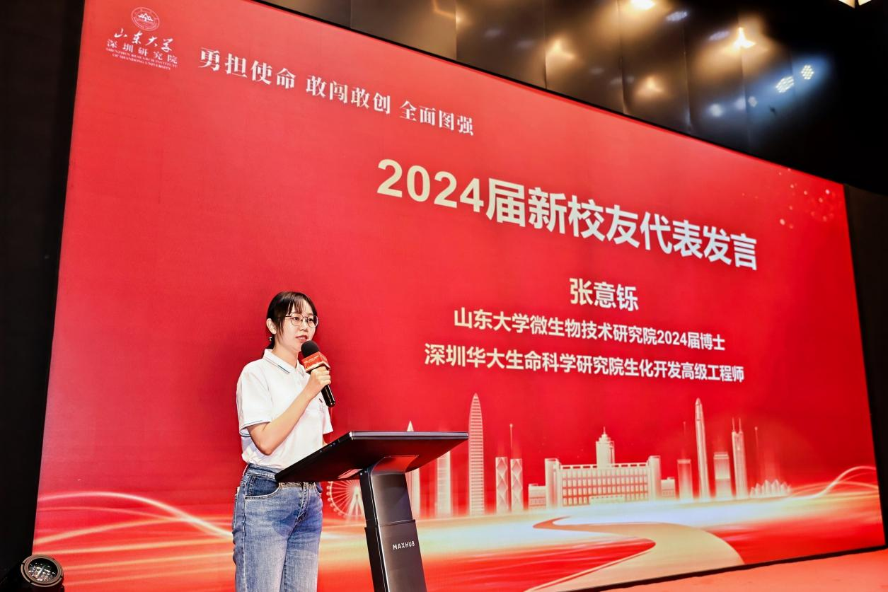 山东大学微生物技术研究院2024届博士、深圳华大生命科学研究院生化所生化开发高级工程师张意铄代表新校友发言,她表示,回望在山东大学的岁月,感谢十年来母校的关怀与培养,在这期间也见证了母校综合实力的快速发展,办学水平的提升、师资队伍的壮大、国际交流的拓展。以后无论走到哪里,自己都将继续秉承“学无止境,气有浩然”的校训精神,将所学知识转化为实际能力,为深圳乃至全国的科研事业贡献自己的一份力量。祝愿山东大学和深圳研究院越办越好,祝愿所有来深的校友们能够在深圳这片热土上鹏程万里、展翅高飞,实现自己的梦想与价值!