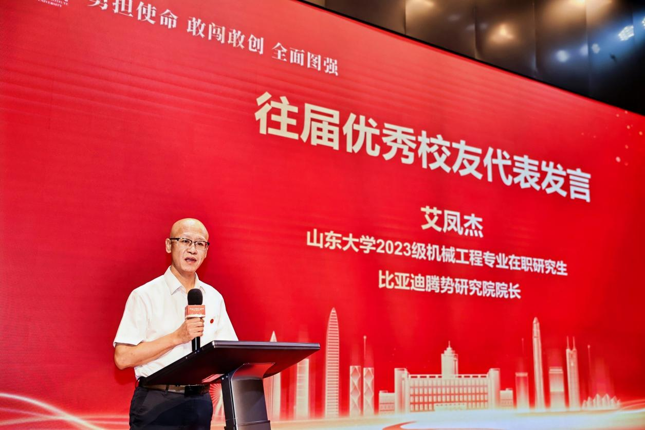 山东大学2023级机械工程专业在职研究生、比亚迪腾势研究院院长艾凤杰代表往届优秀校友发言,他表示,依托山大深圳研究院这个桥头堡,山大与比亚迪达成了深层次的战略合作,在人才培养、科学研究、文化传承、社会服务等方面取得了累累硕果,成为全国产教融合的标杆示范。研究院累计为比亚迪培养高层次人才共计809人,快速满足了企业发展对人才的迫切需要,共同申报的重大项目获国家科技进步奖二等奖,助力国家科技高水平自立自强。自身通过在山大的学习,也接触到了更前沿的科学研究理论,不断完善了自身在专业方面的知识体系,拓宽了国际化视野,提升了整体竞争力。借此良机,他感谢山东大学和深圳研究院各位领导和老师们对比亚迪建设发展作出的重要贡献。同时他也感谢老师的教诲,感谢同学的帮助,在未来的日子里,无论走到哪里,都要牢记自己是山大人,时刻关注母校的发展,为母校争光添彩。