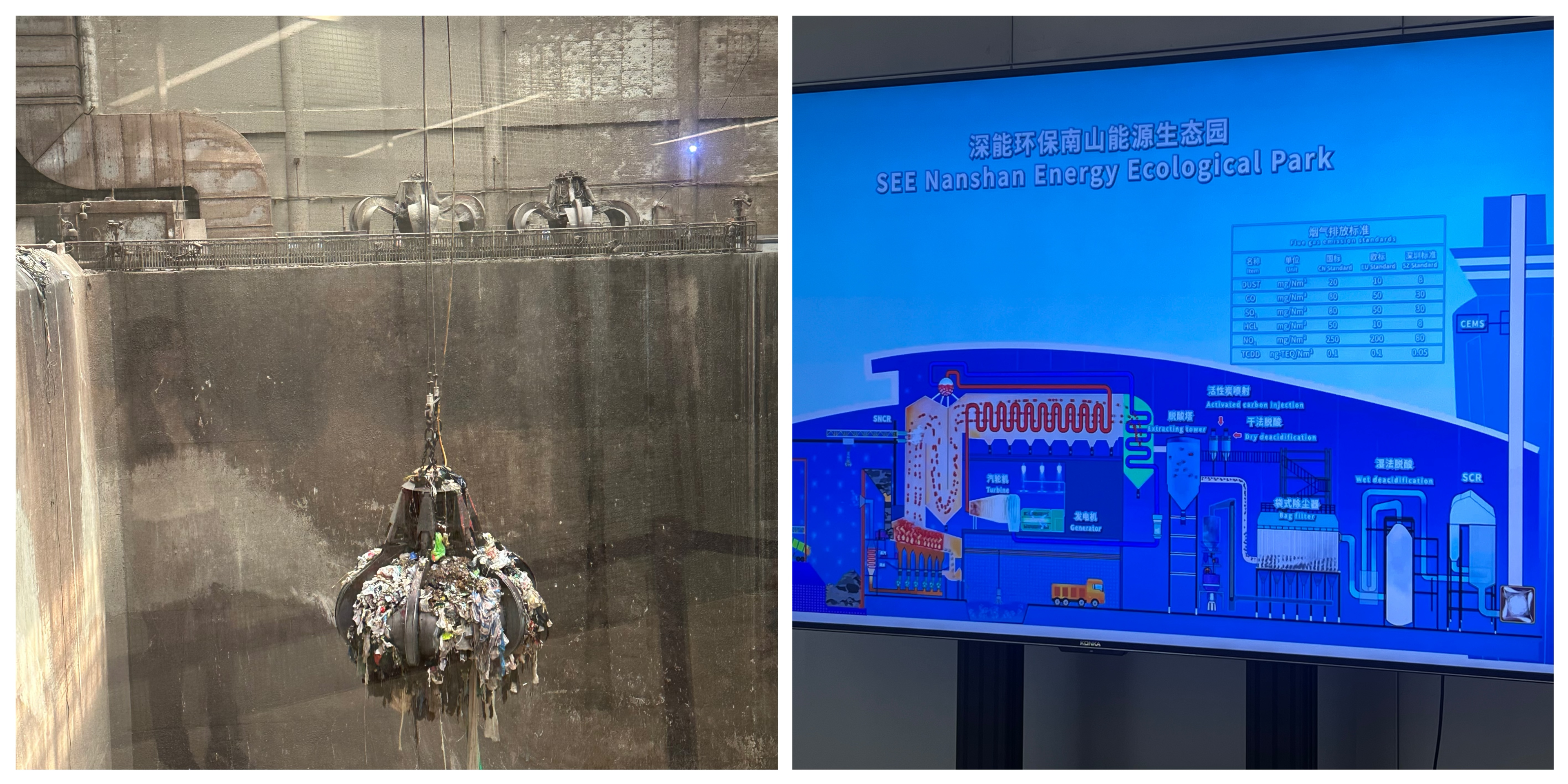 到达南山能源生态园后,同学们参观了生态园的核心区域,包括垃圾焚烧发电设施、环保科普教育区、生态园区等。工作人员通过视频和现场讲解详细介绍了垃圾焚烧发电的技术流程和环保措施,这让同学们对能源生态园的高效运营和环保贡献有了更加直观的认识。