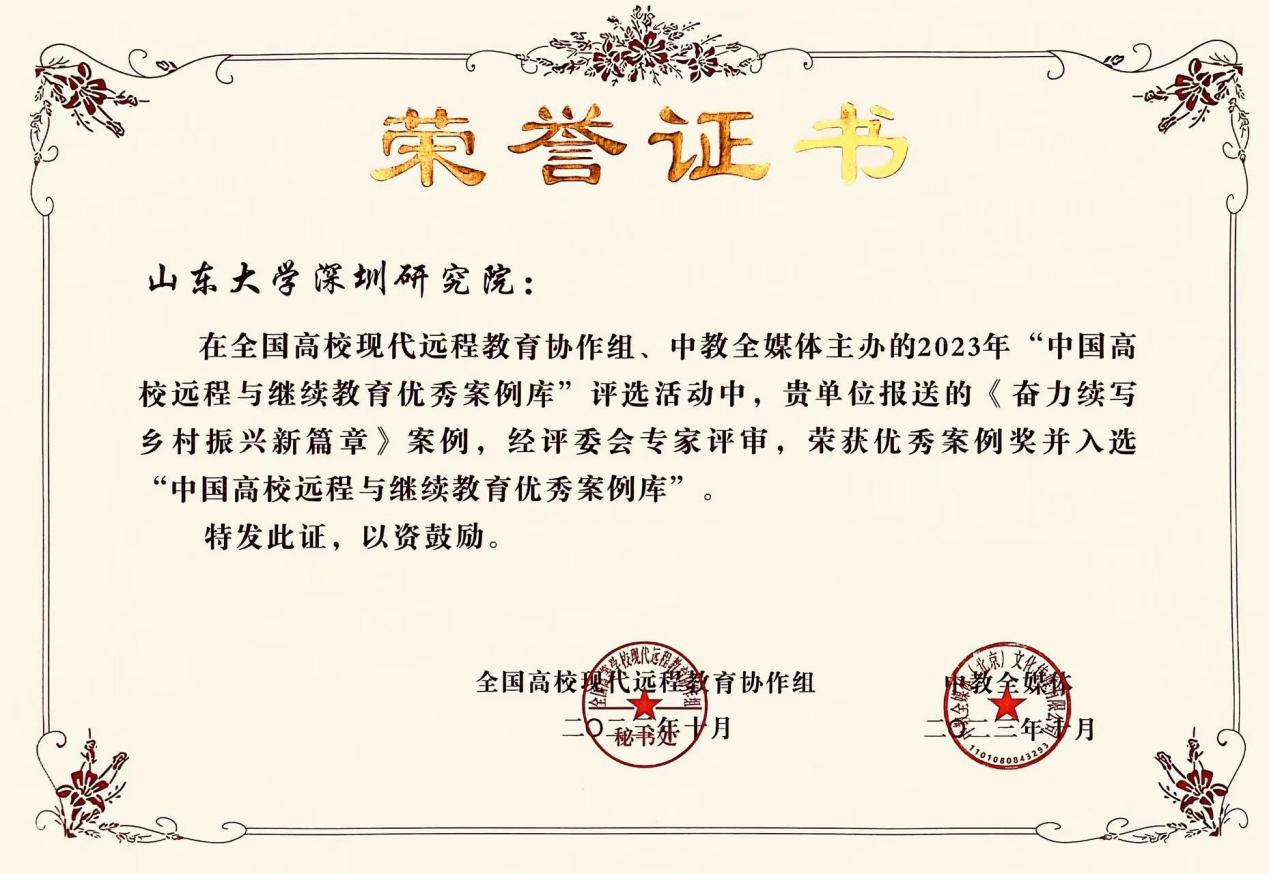 10月19-20日,我国远程与继续教育行业最具影响力年度盛会—2023(第九届)远程与继续教育大会在北京成功召开。本届大会由中国成人教育协会、全国高校现代远程教育协作组指导,中教全媒体主办,《现代教育技术》杂志、《继续教育研究》杂志作为学术支持单位共同支持大会的召开。由山东大学深圳研究院报送的案例《奋力续写乡村振兴新篇章》,经专家组审定,荣获“2023中国高校远程与继续教育优秀案例奖”,并入选《中国高校远程与继续教育优秀案例库》。