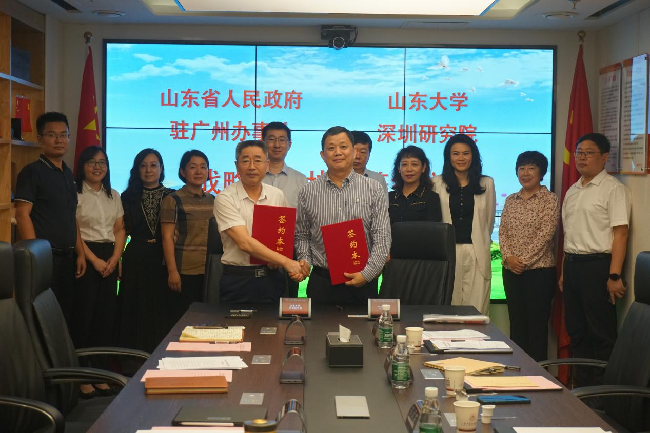 5月24日,深圳研究院与山东省人民政府驻广州办事处举行战略合作协议签约仪式。山东省人民政府驻广州办事处副主任刘风俊、深圳研究院常务副院长王明星代表双方签署战略合作协议,双方将在人才培养及交流、平台共建、产学研合作等方面开展深度合作。山东省政府驻广州办事处社会工作服务处处长张旭、经济联络处处长刘晓静,山东大学服务山东办公室副主任、合作发展部副部长蒋红光出席仪式并见证双方签约。