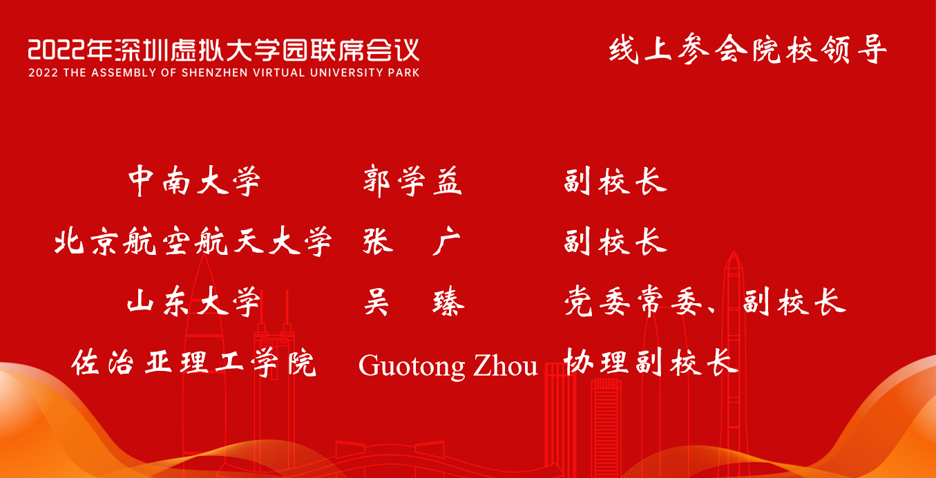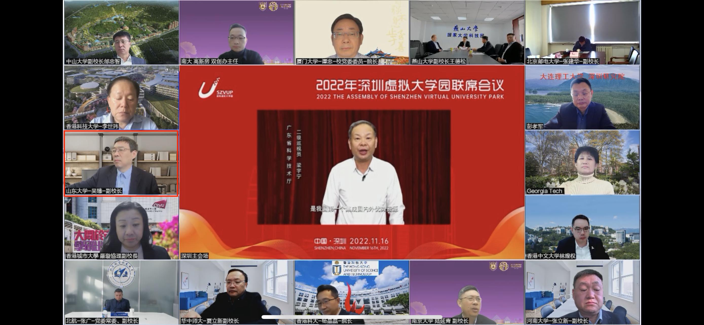 2022年11月16日,以“新时期·新战略·新路径”为主题的2022年深圳虚拟大学园联席会议隆重召开。本次会议围绕党的二十大在教育强国、科技强国、人才强国等方面的战略规划,聚焦成员院校在科学研究、成果孵化、创新创业、产教融合、发展治理等方面的先进经验,就高校院所与湾区的深度互动、共生共荣展开探讨与交流,共同擘画深圳虚拟大学园未来发展的宏伟蓝图。