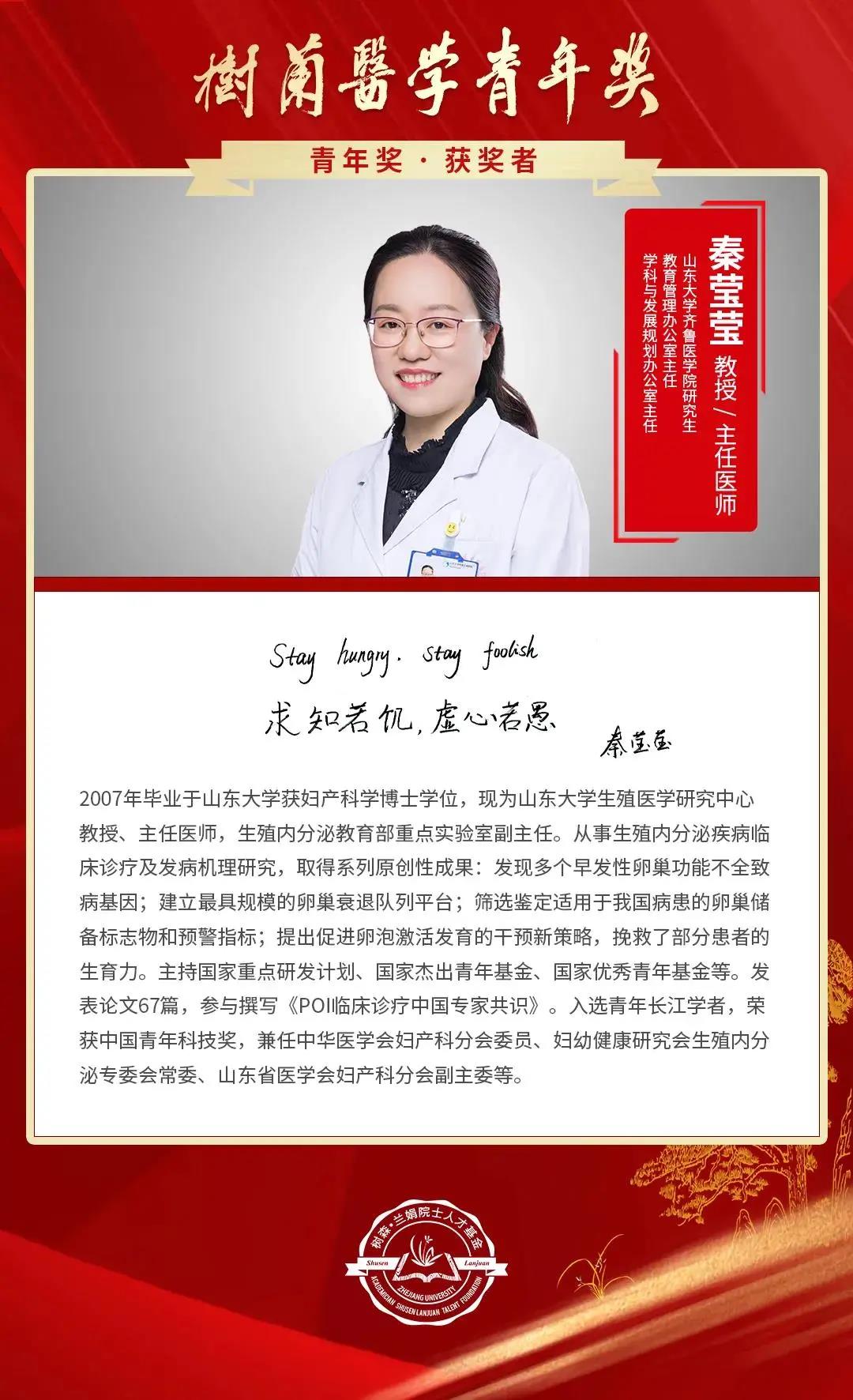 11月20日,第八届“树兰医学奖”名单揭晓,山东大学附属生殖医院教授、生殖健康攀登团队骨干秦莹莹,医学1997级本科、2002级硕士校友王志杰,生物技术1998级校友刘兴国荣获“树兰医学青年奖”。