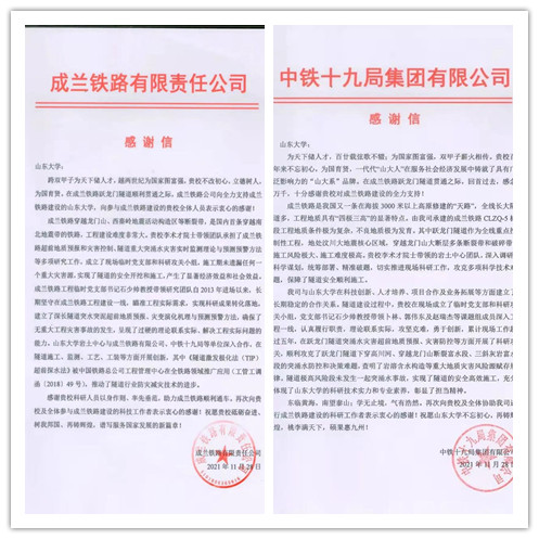 针对跃龙门隧道复杂工程地质条件,李术才院士带领团队针对隧道超前地质预报、突涌水灾害防控等技术难点开展了深入研究,并多次到现场指导。团队通过创新超前地质预报方法,研发铁路隧道探水专用仪器、隧道突涌水新型监测预警系统、特种注浆材料与注浆工艺,攻克了跃龙门隧道下穿高川河段、穿越龙门山断裂富水段、三斜灰岩富水段等隧道极高风险段落的突涌水防控和决策等一系列难题,形成了极高风险岩溶区富水隧道探水方法、隧道突涌水灾害预测预警关键技术与破碎富水段注浆加固关键技术,保障隧道极高风险段施工期未发生重大突涌水事故,确保了隧道安全高效施工,相关研究成果被原中国铁路总公司工程管理中心在铁路领域推广应用。在跃龙门隧道左线顺利贯通之际,建设单位成兰铁路有限责任公司及施工单位中铁十九局集团有限公司特向山东大学发来感谢信,对山东大学为隧道建设作出的贡献给予高度的肯定和赞扬。