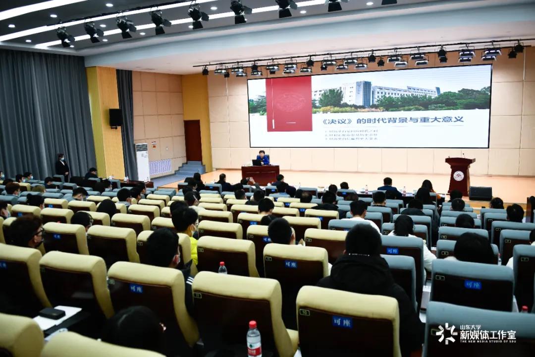 12月17日下午,山东大学校长樊丽明在兴隆山校区为师生代表作“深入学习宣传贯彻党的十九届六中全会精神”辅导报告,结合当前国家发展和学校办学实际,深入解读《中共中央关于党的百年奋斗重大成就和历史经验的决议》(以下简称《决议》)有关内容,全面阐释全会精神,鼓励全校上下从党的百年历史中汲取奋斗的智慧和力量。
