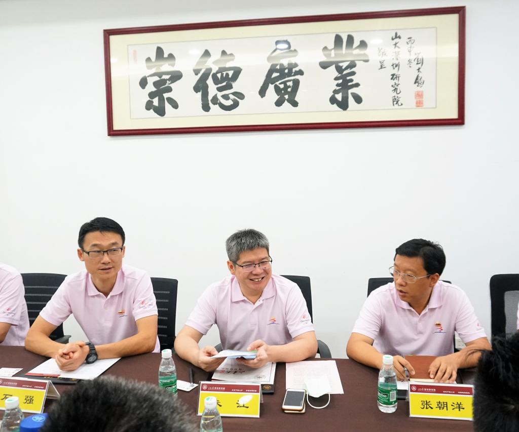 座谈会上,王明星向朱江一行的到来表示欢迎,对青岛市长期以来对山东大学和深圳研究院的大力支持表示感谢。随后他介绍了深圳研究院的发展历程、发展现状、存在的问题和未来规划,他表示研究院作为连接山东大学与粤港澳大湾区互动交流的桥梁和纽带,依托自身平台优势、区位优势和山东大学的学科优势,联合深圳市山东商会、山大深圳校友会以及粤港澳大湾区合作伙伴,共同整合优质资源,践行服务山东战略和粤港澳大湾区发展规划,积极推动学校和地方合作,为青岛市做好青年人才培养、前沿技术交流和产业融合发展等工作,对接青岛市和深圳市的产业需求,以创新驱动、产业引领的模式,服务国家和区域经济社会发展,持续深化改革,突出重点,提升能力,全力助推山东大学“双一流”建设、“百廿山大强校兴国”战略实施,为加快深圳建设社会主义先行示范区做出更大贡献。