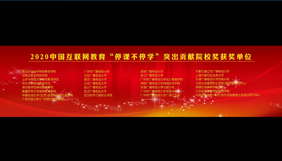 会上,在线举行了2020中国互联网教育评选盛典,全国高校现代远程教育协作组和《中国远程教育》杂志社授予表彰了山东大学继续教育学院、深圳研究院等86家院校“2020中国互联网教育‘停课不停学’突出贡献院校奖”,以此记录在这次特殊事件中行业众志成城、攻坚克难的奋斗历程。