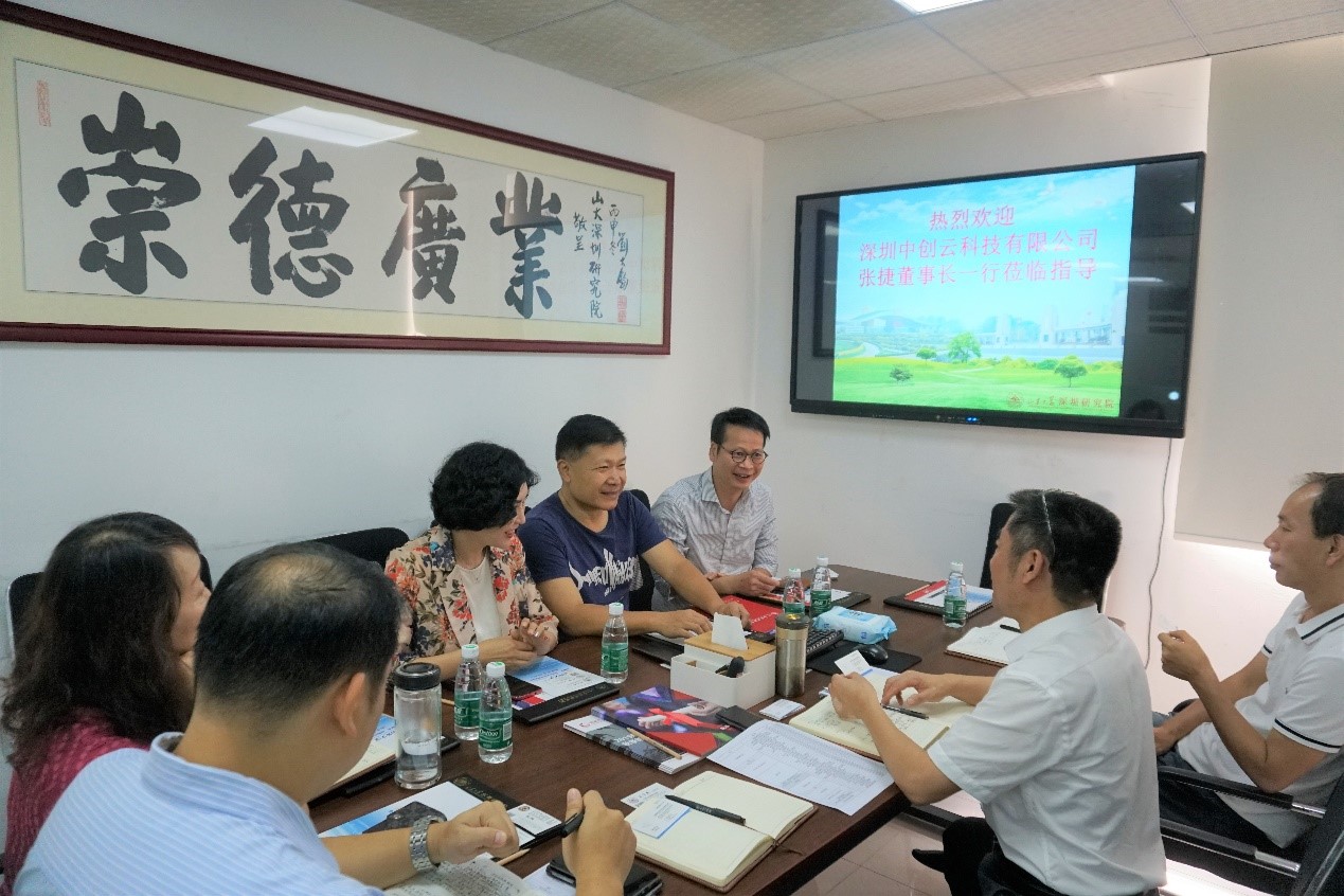 10月10日上午,深圳中创云科技有限公司董事长张捷一行莅临深圳研究院考察交流,山东大学深圳研究院常务副院长兼合作发展部副部长王明星陪同张捷一行参观了虚拟大学园的教育科研环境及研究院的办公环境,随后与调研组一行进行了座谈。