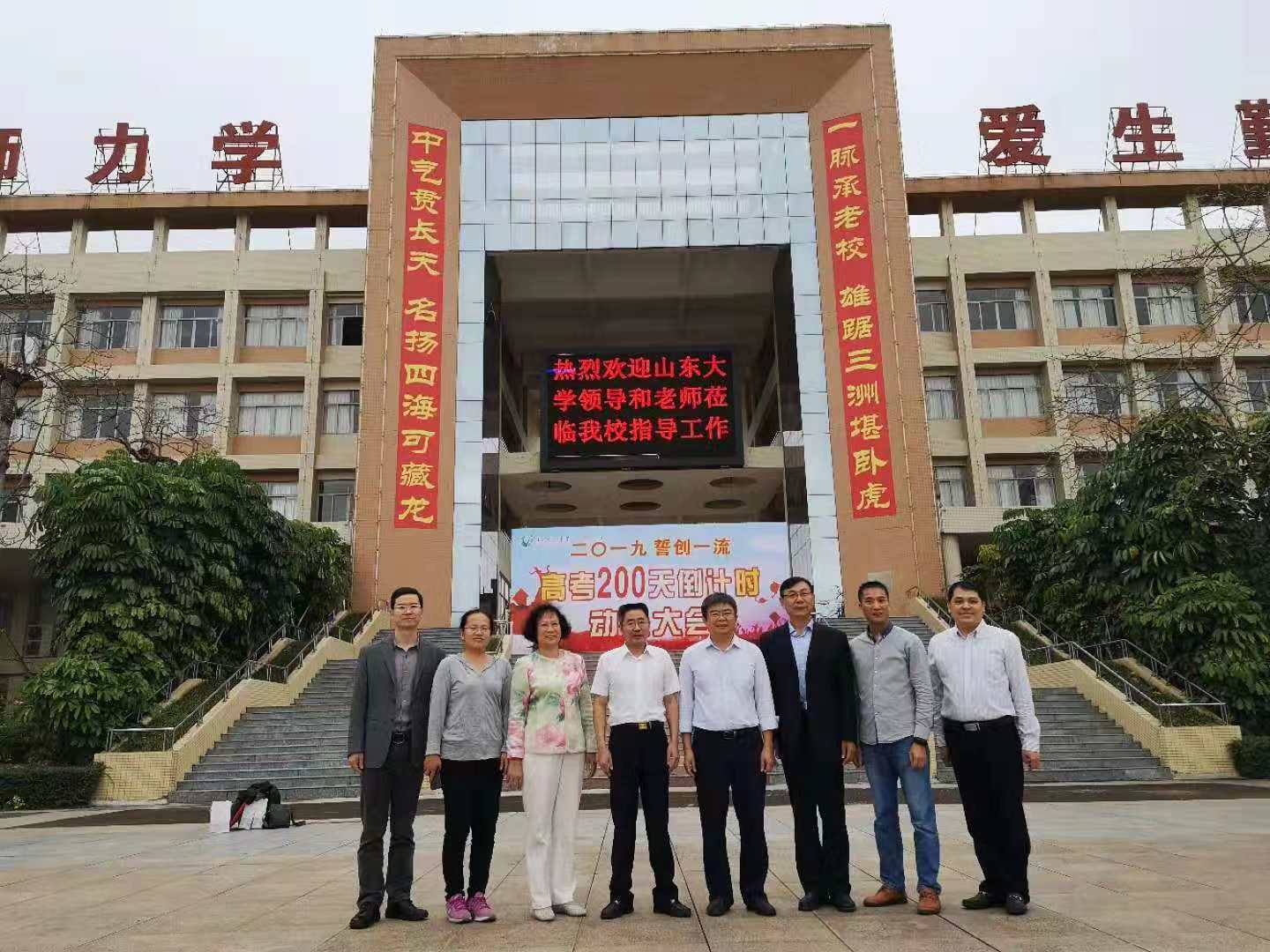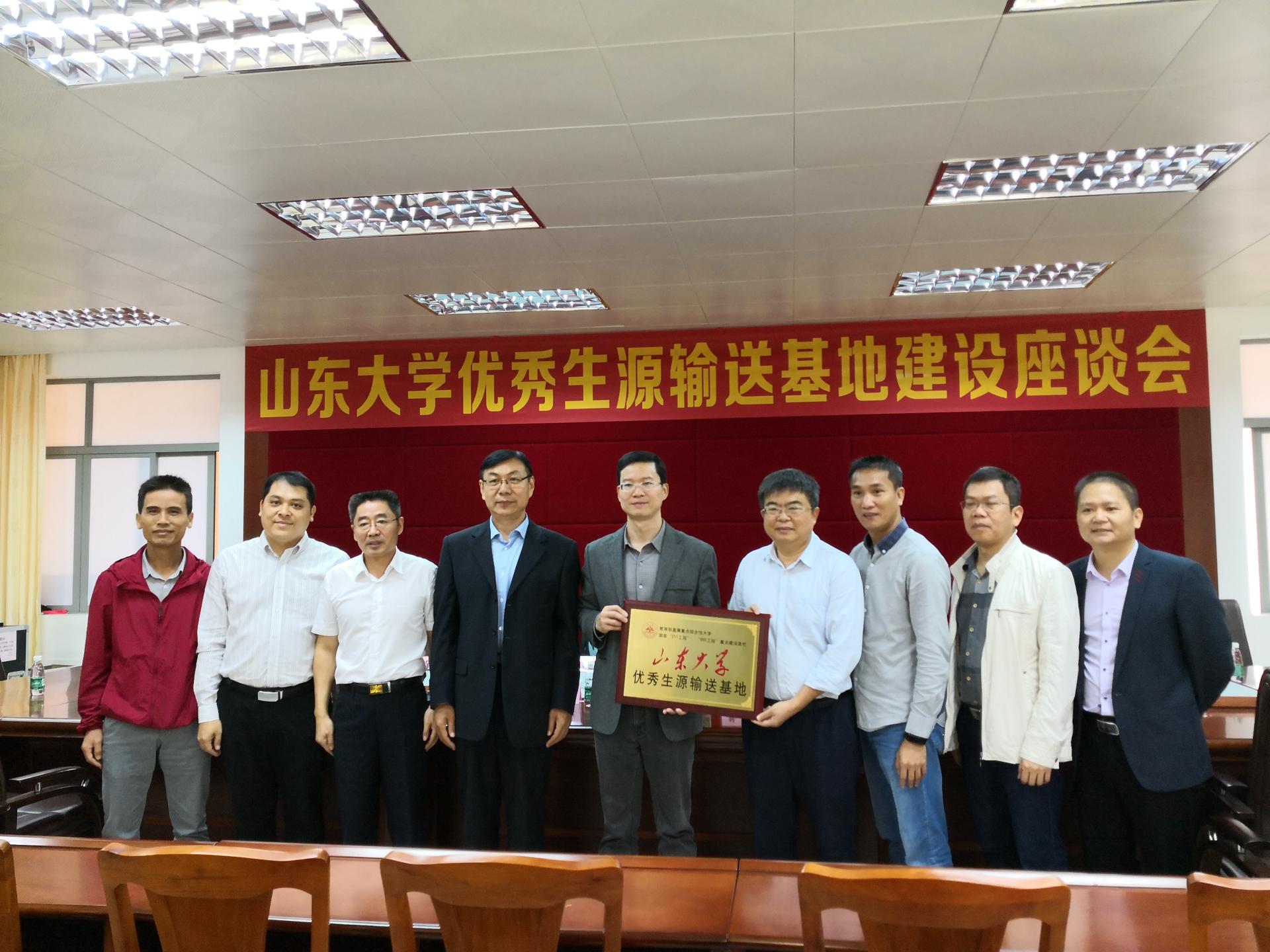 11月16日至19日,山东大学广东省招生拓展组组长、微电子学院党委书记王卿璞、山东大学本科招生办公室副主任徐志全、深圳研究院常务副院长兼合作发展部副部长王明星在广东省深圳市、和阳江市两地开展为期4天的招生拓展活动,分别在深圳中学、深圳市红岭中学、阳江市第一中学举行合作共建“山东大学优秀生源输送基地”签约授牌仪式及招生合作座谈会,深圳中学升学指导中心主任马靖、红岭中学副校长刘仁淮、阳江一中校长陈恕等学校领导出席会议。王卿璞为优秀生源输送基地授牌并签订合作协议书,徐志全在阳江一中举行了招生宣讲会,受到学校领导和师生的热烈欢迎。深圳研究院办公室主任王飞虎,教育培训部副部长余天豪陪同参加招生拓展活动。