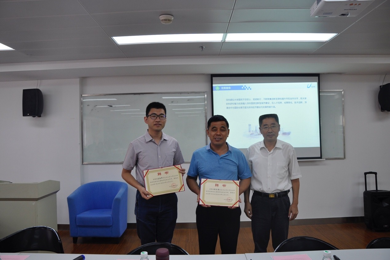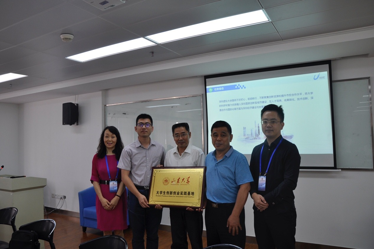 随后,山东大学创新创业学院马金平主任代表学校向深圳研究院授《山东大学大学生创新创业实践基地》牌匾,山东大学深圳研究院常务副院长王明星向陈言俊、马金平两位创新创业导师颁发聘书。