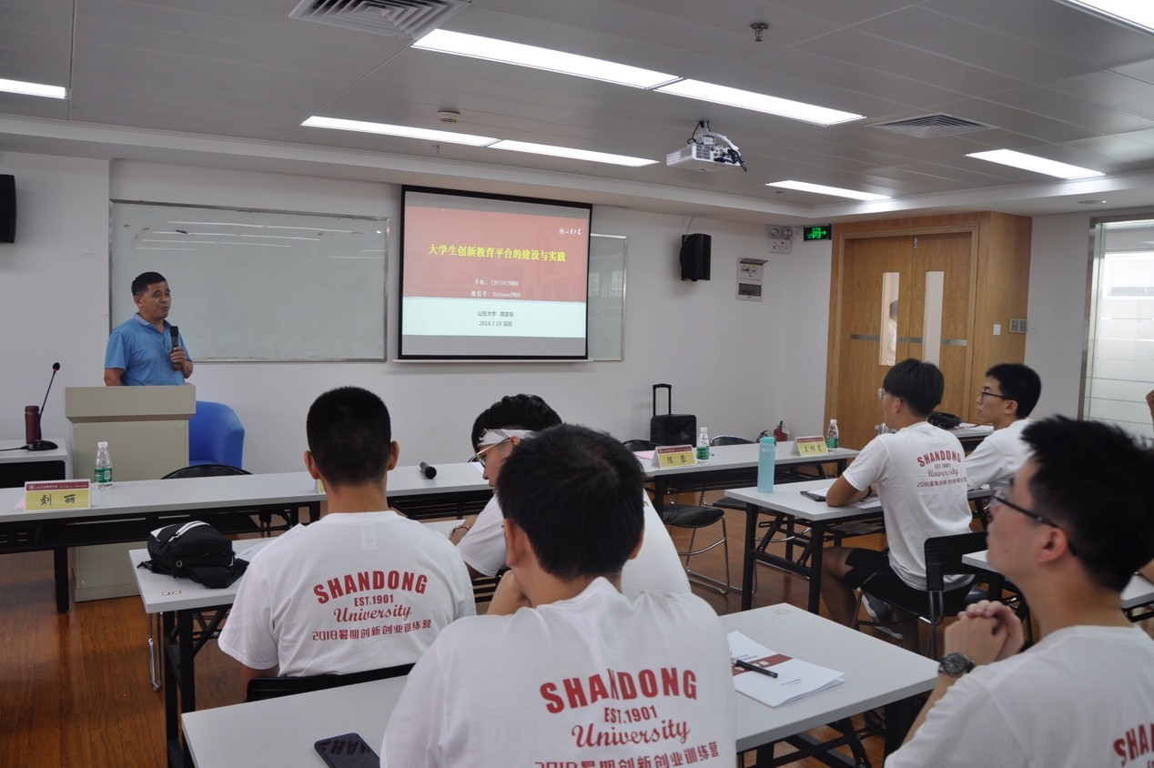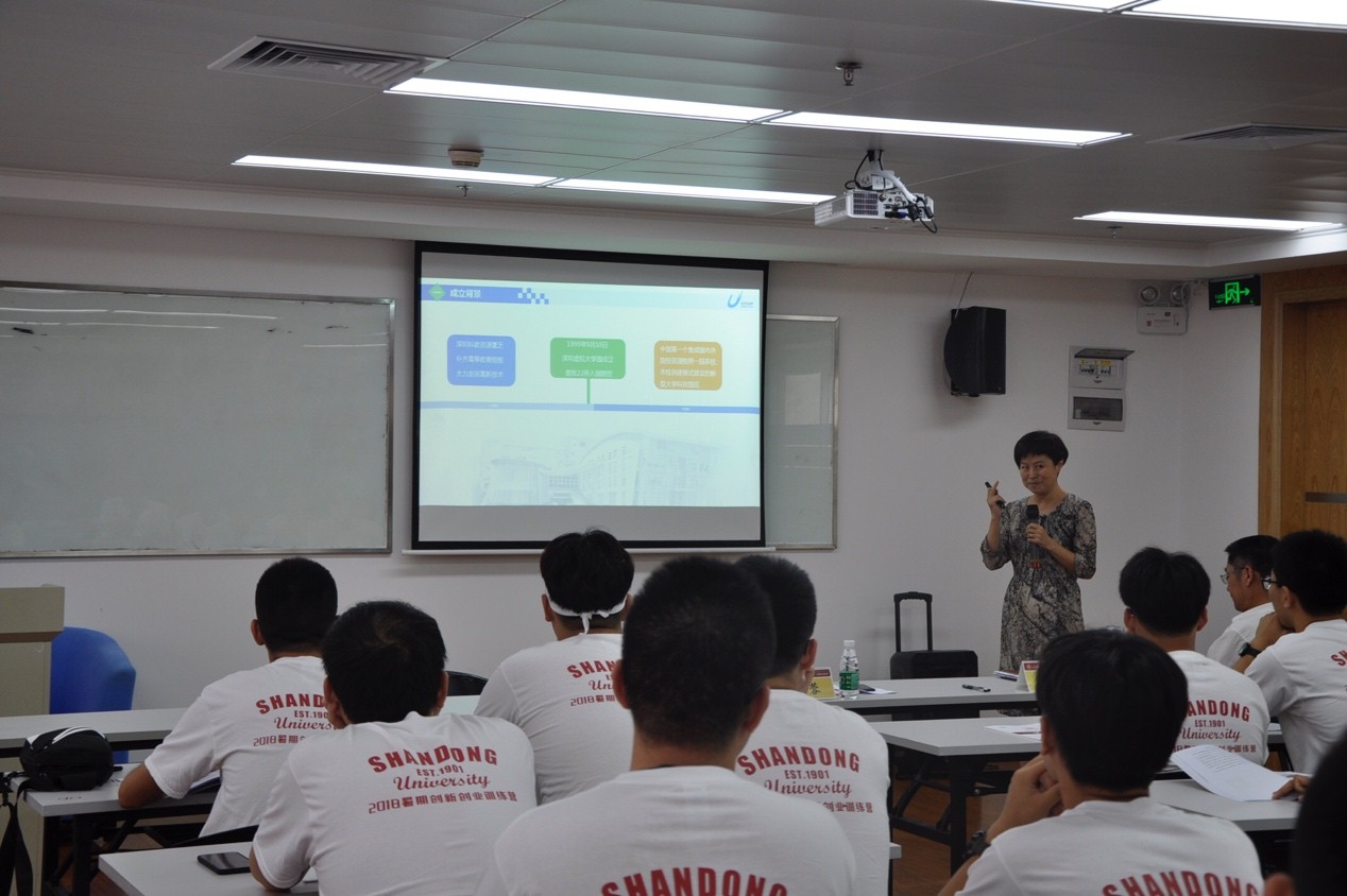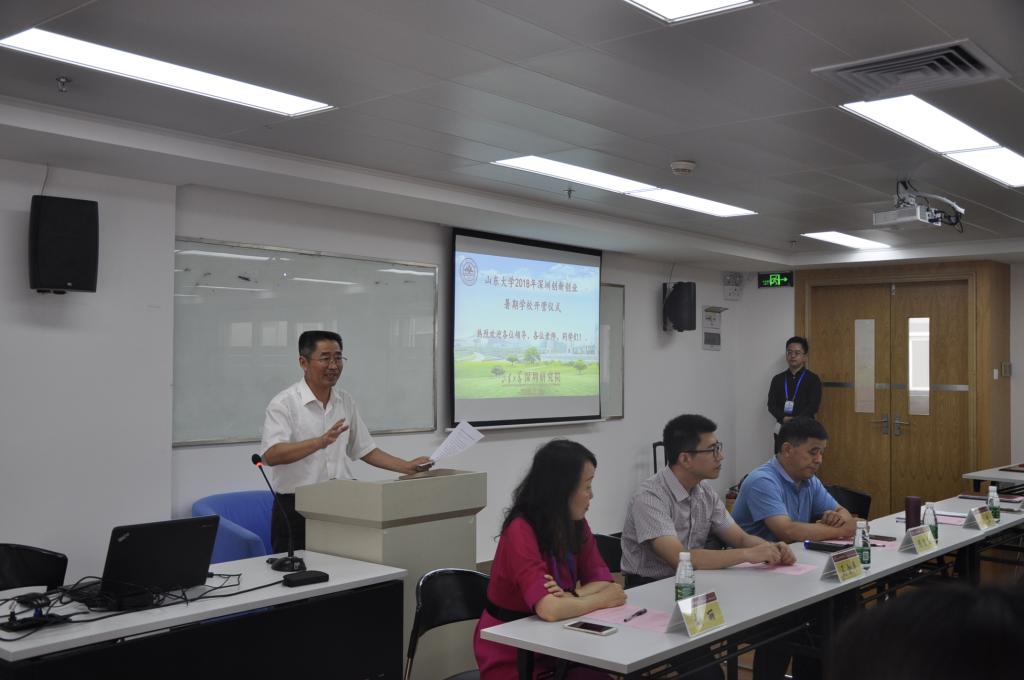 为提升在校大学生的创业意识,培养创业精神,增加创业体验,由深圳市团委、科技创新战略研究中心、山东大学创新创业学院、本科生院、共青团山东大学委员会、山东大学深圳研究院主办的2018年深圳创新创业暑期学校于7月19日在深圳虚拟大学园正式开营。山东大学创新创业学院陈言俊教授、马金平主任,科技创新战略研究中心陈蓉部长,山东大学深圳研究院常务副院长、合作发展部副部长王明星、山东大学深圳研究院教育培训部部长刘丽、科技合作部高级主管任虹霖出席开营仪式,仪式由深圳研究院办公室主任王飞虎主持。