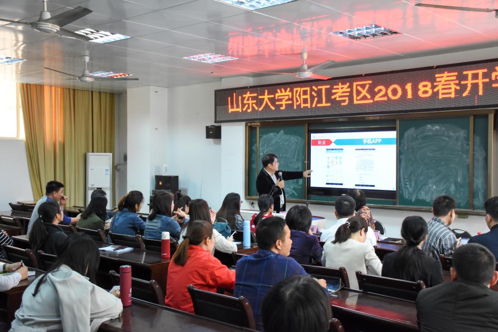 3月23日,山东大学网络教育2018年春季广东省“执业药师能力与学历提升计划”项目阳江班开学典礼,在阳江市食品药品宣传教育中心举行。山东大学深圳研究院教育培训部副部长余天豪、阳江市食品药品监督管理局副调研员何秀珠出席了开学典礼。45名新生参加了开学典礼。