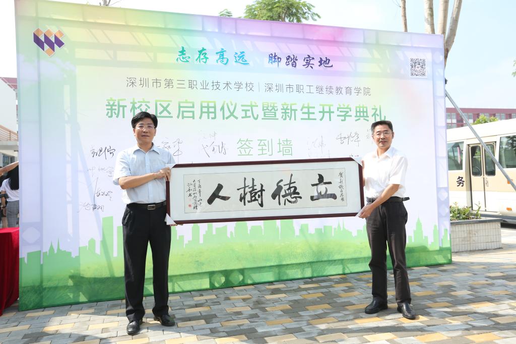 仪式在雄壮的国歌声中拉开帷幕,靖建瑞校长致欢迎词,市教育局领导、坪山区领导、市总工会领导分别讲话,祝贺新校区启用、并祝福所有的同学在这里开启新的人生。王明星代表研究院赠送了由山东大学本科生院齐炳和老师书写的字画“立德树人”。