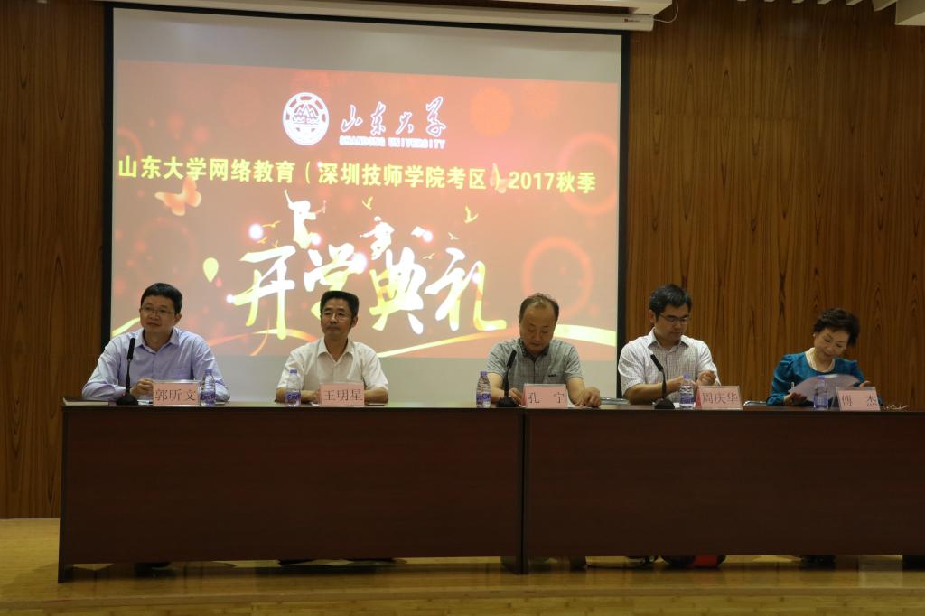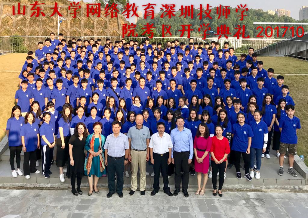 10月26日,山东大学网络教育(深圳技师学院考区)2017年秋季开班仪式在深圳技师学院举行。山东大学继续教育学院副院长周庆华,山东大学深圳研究院常务副院长、山东大学合作发展部副部长王明星,山东大学深圳研究院副院长、山东大学深圳校友会副会长傅杰,深圳技师学院副院长孔宁以及217名秋季新生出席了此次开班仪式。开班仪式由深圳技师学院继续教育与培训中心副主任郭昕文主持。