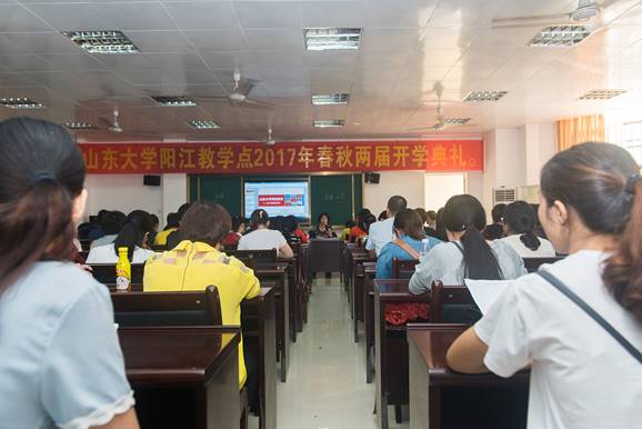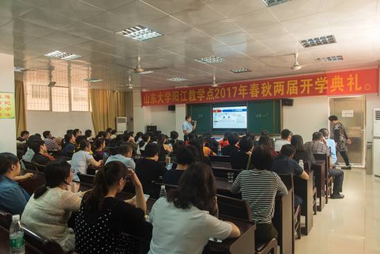 10月27日,山东大学网络教育2017年广东省“执业药师能力与学历提升计划”项目阳江班开学典礼在阳江市食品药品宣传教育中心举行。阳江市食品药品监督管理局副调研员何秀珠、山东大学深圳研究院教育培训部副部长余天豪出席了开学典礼。94名山东大学网络教育2017年“执业药师能力与学历提升计划”项目阳江考区新生参加了开学典礼。