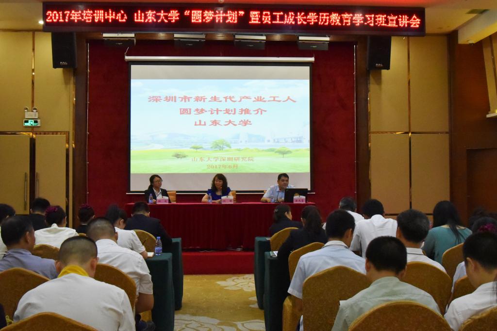 “圆梦计划”是由共青团广东省委联合广东省教育厅、省财政厅、省人力资源和社会保障厅等多个单位共同实施的公益项目。该项目立足广东加快产业转型升级核心任务,瞄准新生代产业工人提升综合素质核心诉求,重点资助广东新生代产业工人参加以网络远程教育形式为主的高等学历教育,力争打造成为“三工程一通道”:即党在新生代产业工人群体中基本可依靠力量的培养工程;实现社会管理创新,推动产业工人群体“自我管理、自我服务”的骨干培养工程;助推“广东制造”走向“广东创造”、加快转型升级的高素质劳动者培养工程;新生代产业工人成长发展的向上通道。自2014年起,山东大学深圳研究院连续3届参加了广东新生代产业工人“圆梦计划”学历与能力提升公益项目工作,面向各行业需求,全面开设了30个专、本科专业,共招生培养了专、本科学生883人,影响力在广东地区逐年提升。山东大学深圳研究院常务副院长兼山东大学合作发展部副部长王明星曾多次接受人民日报、深圳卫视、第一现场、深圳晚报等主流新闻媒体的采访报道。