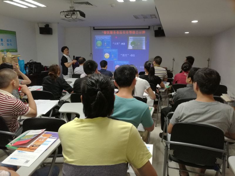 创建示范街的业务总监刘敏主任为示范街内的近20家餐饮单位的30名有关人员做了2小时的培训培训的主要内容为餐饮服务食品安全操作规范及示范达标要求。培训通过图片、案例等鲜活的例子,向在场的每一位敲响警钟,食品安全关乎每一位市民,必须高度重视。培训结束后,所有参训人员进行了闭卷考试。