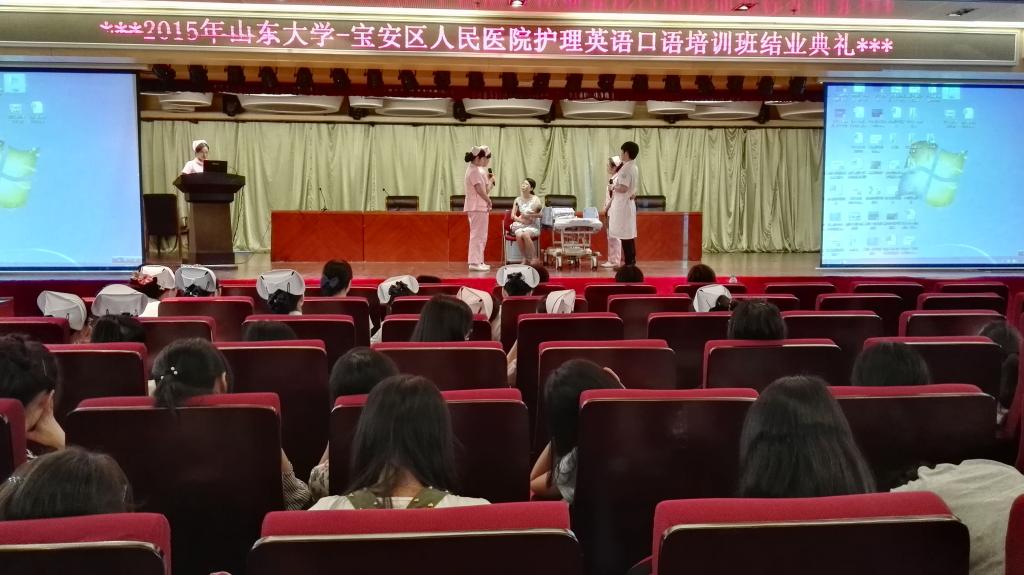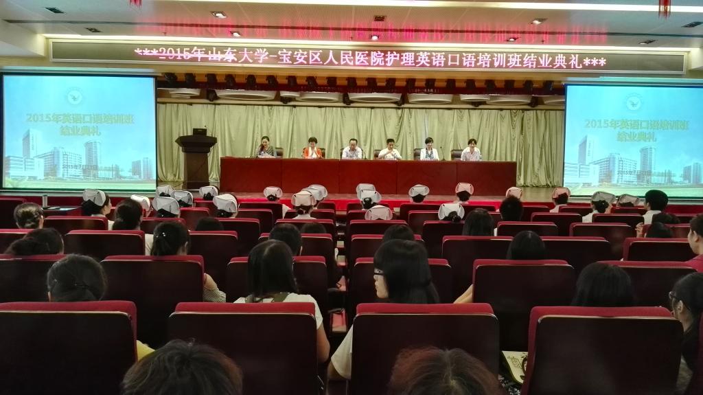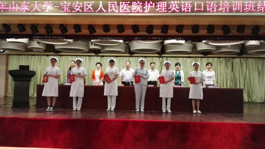 7月21日,由山东大学深圳研究院与宝安区人民医院联合举办的护理英语培训班结业典礼仪式在深圳市宝安区人民医院举行,宝安区人民医院副书记刘锦涛、护理部主任张友惠、山东大学护理学院副院长臧渝梨、山东大学深圳研究院常务副院长王明星、副院长傅杰、教育培训部部长刘丽一同出席了结业典礼。仪式由宝安区人民医院院长助理杨云智主持。
