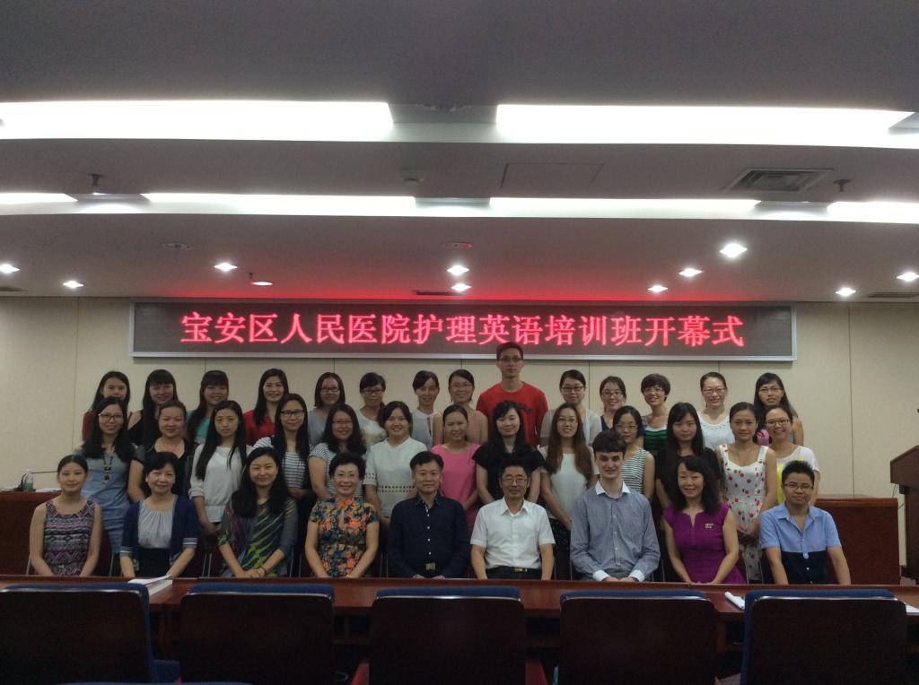 6月6日,由山东大学深圳研究院与宝安区人民医院联合举办的护理英语培训班开班仪式在深圳市宝安区人民医院门诊楼19楼学术报告厅隆重举行,宝安区人民医院副院长王立军、护理部主任张友惠、山东大学护理学院外教程大伟、山东大学深圳研究院常务副院长王明星、副院长傅杰、教育培训部部长刘丽一同出席了开班仪式。仪式由宝安区人民医院院长助理杨云智主持。此次开班的宗旨是提高基层护理人员的专业素养和英语表达能力,促进与国际病患的顺畅沟通,打造一支国际化医疗护理队伍。